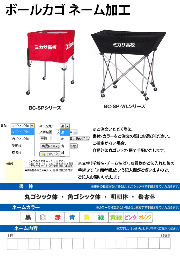 ボールカゴ/ネーム入れ加工書体:丸ゴシック体・角ゴシック体・楷書体カラー:黒・白・赤・青・黄・緑・黄緑・ピンク・オレンジ※幕体のカラーと同じカラーのネームは入りません。